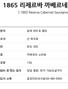 Food62 1865 와인 종류와 특징!! 1865와인은 총 6개의 라인을 갖고 있습니다. 가격도 조금씩 다르고~ 병모양도 다르고~ 1865 와인의 종류와 특징에 대해 알아보겠습니다. ^^ 아래 사진은 개인적으로 가장 선호하는 1865 쉬라입니다. ~~ 1865 와인은 마트나 백화점에서 가장 많이 볼 수 있는 눈에 익은 와인일텐데요? 그만큼 우리나라에서 소비하는 와인 중 가장 많이 판매되는 와인이라고 해요~ 특히, 신세계 센텀시티백화점 와인판매장을 가보면 1865 우드박스로 매장 전체 와인 진열박스로 활용하더라구요. ^^ 그만큼 판매량이 많은 인기 와인이고 와인초보자들도 쉽게 접근가능한 와인으로 강추드려요.^^ 1865 와인 첫번째, 우아하고 풍부한 과일향을 지닌 1865 싱글빈야드 까베르네 쇼비뇽 1865와인 두번째, 그린 후추향을 동반한 강한.. 2014. 12. 16. 몬테스알파 까르미네르(Montes Alpha Carmenere) 몬테스알파 까르미네르 맛보고 가실께요.^^ 몬테스알파는 늘 기본은 하는 와인이죠. 몬테스알파 피노누아에 비해 좀 더 달콤한 타닌감과 매끄러운 목넘김을 주는 와인입니다. 국내 코스트코에서는 4만원정도 하지만~ $12.99 라는 합리적인 가격도 몬테스알파 까르미네르의 매력적인 요인이기도 하죠.!! 칠레산 레드와인 몬테스알파 카르미네르는 레드와인이지만~ 달콤한 타닌으로 인해 육류보다는 해산물 요리나 튀김요리와 잘 어울립니다. 과일, 버섯, 바닐라, 스파이시, 오크의 맛과 향을 지닙니다.^^ 2014. 12. 16. 몬테스 알파 피노 누아(Montes Alpha Pinot Noir) 칠레산 레드와인 몬테스 알파 피노 누아 맛보고 가실께요.~~ 가격도 적당하고~ 드라이한 와인을 좋아하는 편이라 자주 손이 가는 와인입니다. 스테이크는 물론 진한소스를 가미한 생선류와도 잘 어울리구요 부드러우면서도 무난한 탄닌감으로 와인을 처음 접하시는 경우에도 추천드리고 싶은 와인이네요. 코스트코에 가면 여러병씩 구입해두는 와인리스트~ 아이템^^ 행복한 연말~~ 연인이나 가족과 함께 몬테스 알파 피노 누아 어떠세요? 2014. 12. 15. 상큼한 와인! 아니스톤 베이 셰닌블랑 샤도네이 2004 (남아공) 오늘 소개할 와인은요! 바로 아니스톤 베이 셰닌블랑 샤도네이 2004 (남아공) 이랍니다. 남아공의 대표 화이트 와인의 품종인 쉐닝블랑을 베이스로 샤도네이와 블랜딩을 한 미디엄 바디의 와인으로 적당한 산미와 약간의 당도도 느낄 수 있습니다. 잘익은 멜론과 풋사과.... 그리고 파인애플 및 라임향이 상쾌하고 상큼한 느낌을 주는데요, 시시각각 변화하는 풋풋한 과일 향과 맛이 은은하게 전해지며, 깔끔한 청량감까지 돋보이는 와인이죠. 사실! 더운 여름 차갑게 해서 가볍게 한 잔 하기 좋은 와인으로 소개되기도 하는데요.... 저는 딱 지금 계절에도 상큼함이 생각날 때 딱! 어울리는 와인이라고 생각한답니다. 오늘 저녁엔 상큼하고, 청량감을 주는 와인 한 잔 어떠세요? 2014. 12. 14. 상쾌한 페퍼민트 차 한잔하세요 ♬ 주말 잘 보내고 계신가요^^? 오늘은 상쾌한 '페퍼민트 차'에 대해 알려 드릴게요 :) ★ 페퍼민트 효능 4가지 페퍼민트는 멘톨이 함유되어 있다고 알려져 있는데요, 그 함량이 상당히 높아 가끔 잎이나 추출된 오일에서 크리스탈이 생기기도 한답니다. 주로 약초용 허브나 향료로 오랫동안 사용되어 왔으며, 그 잎에서 추출하는 페퍼민트 오일은 마사지 오일의 하나로 사용되고 있기도 해요! 그러니 주말을 맞아 오늘 하루는 커피보다 페퍼민트 한 잔으로 하루를 상쾌하게 시작해보는 것은 어떨까요? 하나. 집중력 강화 페퍼민트는 정신을 맑게 하고 집중력을 강화시키는데 아~주 탁월하답니다. 그래서 시험을 앞둔 수험생이 마시면 굉장히 좋다고 해요 :) 둘. 두통 치료 두통이 있을 때, 페퍼민트 차를 마시면 해소되는 효과를 기대.. 2014. 12. 13. 일교차 심한 요즘 "생강차" 드세요. 뜨끈한 생강차의 계절이 돌아왔네요~ 전 손발이 찬 편이라 생강차를 즐겨 마셔요! 몸이 찬 사람에겐 생강차가 굉장히 좋다고 합니다. 생강차는 살균작용,항암 효과에 정력 보강까지 정말 놀~~~~라운 효능까지 가지고 있네요!! 오늘은 생강차의 효능과 만드는 방법에 대해 알려드릴께요~ 생강차 효능 및 특성들 소개합니다. 1.저혈압 및 숙취해독에 좋다고 합니다. 2.생강의 매운 맛을 내는 성분은 우리 몸의 신진대사를 촉진해 몸을 따뜻하고 혈액 순환을 촉진시켜 준다고 합니다. 3.위장을 강화시키고, 소화를 촉진해 복통을 가라 앉히고 설사를 멎게 해준다고 합닏. 4.손과 몸이 따뜻해지면 감기 증세를 예방·치료하고 냉증, 저혈압 증세에도 좋다고 합니다. 5.생강차는 겨울철 감기 예방을 위한 차로서는 최상이라고 하네요^.. 2014. 12. 11. 빌라 엠 알레그로(villa M Allegro) 오늘 소개 할 와인은 빌라 엠 알레그로(villa M Allegro) 입니다~^^ 술을 잘 못 드시는 여성들도 좋아할 정도로 맛있는 와인이죠^^ 너무 맛있다고 많이 드시면 정말 소주보다 빨리 취합니다~~~ 이제부터 와인소개 들어갑니다~ 와인의 종류 : 화이트(White) 빈티지 : 생산자(수입원) : 지아니 갈리아도 (Gianni Gagliardo) 지역 : 피에몬테(piemonte) 생산국 : 이태리(Italy) 회원사 : 아영FBC 병사이즈 : 750 ml 음용온도 : 10~12 C 알코올도수 : 12 % 포도품종 : 파보리